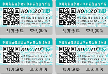 數碼刮開式防偽標簽是在紙面標簽的基礎上,噴印數碼信然后再以特種油墨覆蓋印制而成。數碼防偽標簽分面層、次層、黏膜層、底層四部分,面層是可去除銀粉薄膜,能夠印刷文字、圖案;次層是有色或白色銅版紙或易碎紙,印有防偽身份碼;黏膜層為久標識膠;底層為用于防粘的離型紙。
